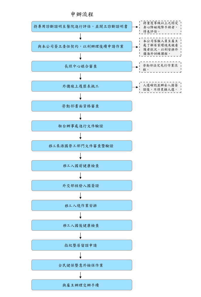 - 本公司協助雇主辦理期滿重新招募皆以快件處理,前後任看護工將不會出現空窗期。