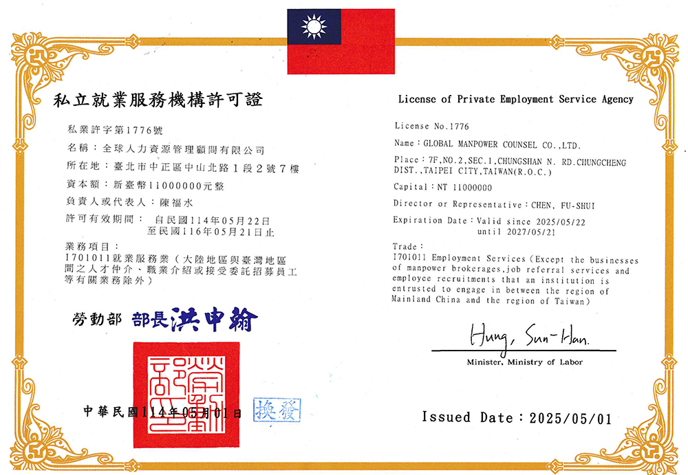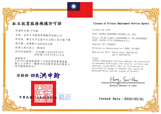 由於資訊快速發達,汎資訊化的競爭生態,使得企業間最大的優勢必須取決於人才 ,網羅優秀人才,因才適任,才能強化企業的戰鬥力,而唯有透過專業負責的人力仲介公司,才能讓企業以最效率、經濟、整體的方式達到全方位的人才運用與發揮 。本公司是一家獲得中華民國勞動部核發許可執照,可從事外籍移工引進之人力仲介公司。 | ||